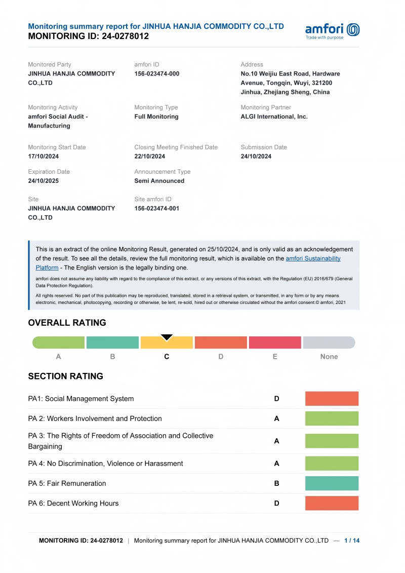 ဇူလိုင်လ 2025 တွင်,Jinhua Hanjia ကုန်ပစ္စည်း Co. , Ltd.သမဝါယမယူနီယံစီမံခန့်ခွဲမှုဖြင့်ခန့်အပ်ထားသောတတိယပါတီဥရောပစစ်ဆေးရေးအေဂျင်စီမှပြုလုပ်သောစံသတ်မှတ်ချက်များ (ICS) စက်ရုံစာရင်းစစ်ဆေးခြင်းအစီအစဉ်တွင် C-Level Certification တွင် C-Level Certification တွင်အောင်မြင်စွာရရှိခဲ့သည်။ ဤလက်မှတ်စနစ်တွင်အုတ်မြစ် 4 ခုပါ 0 င်သည်။